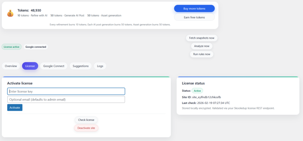 Once you click the “SKP AI Data” tab you visit the admin dashboard of the plugin. Enter your license and email information.