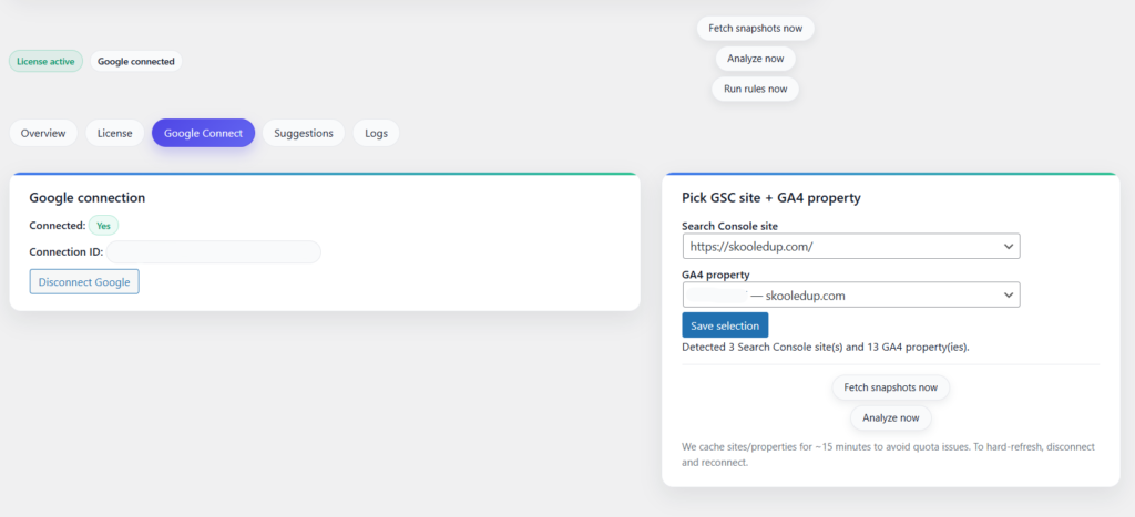 Connect your Google search console and Google analytics accounts in the google connect tab.