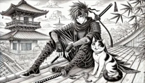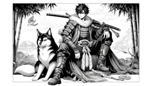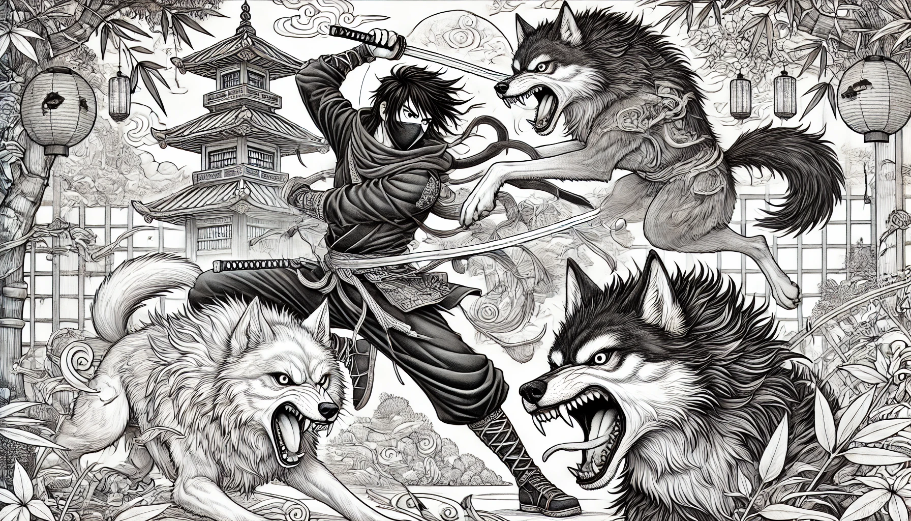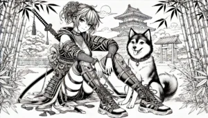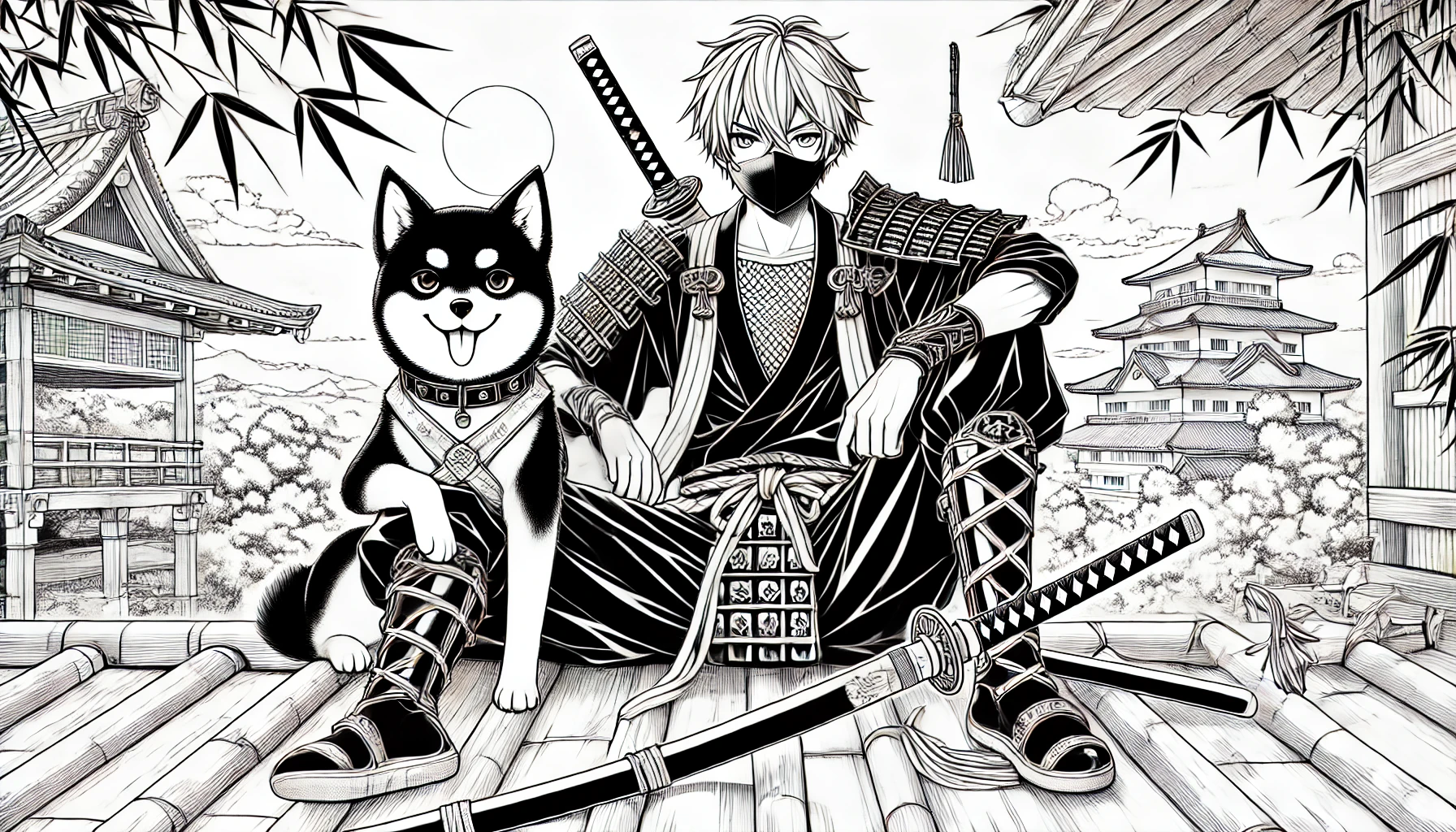 Ai generated anime coloring page a ninja and his dog in photographic poses