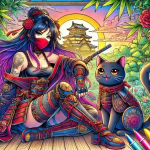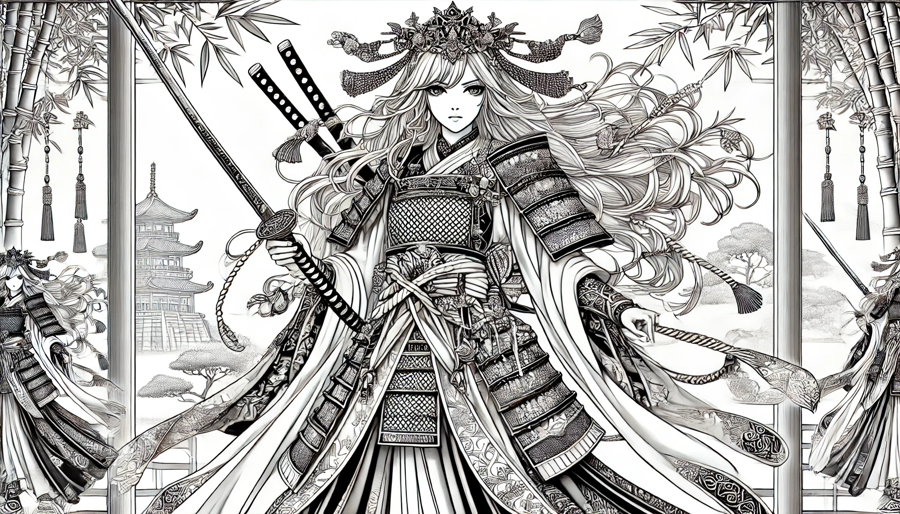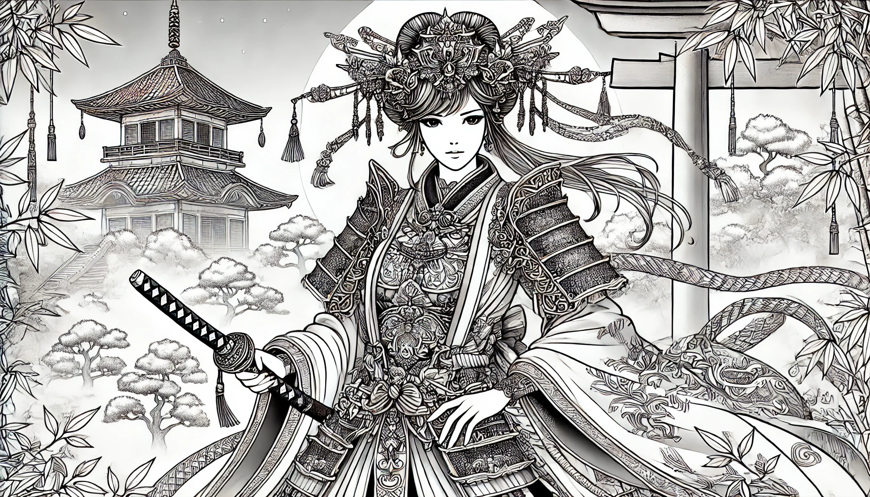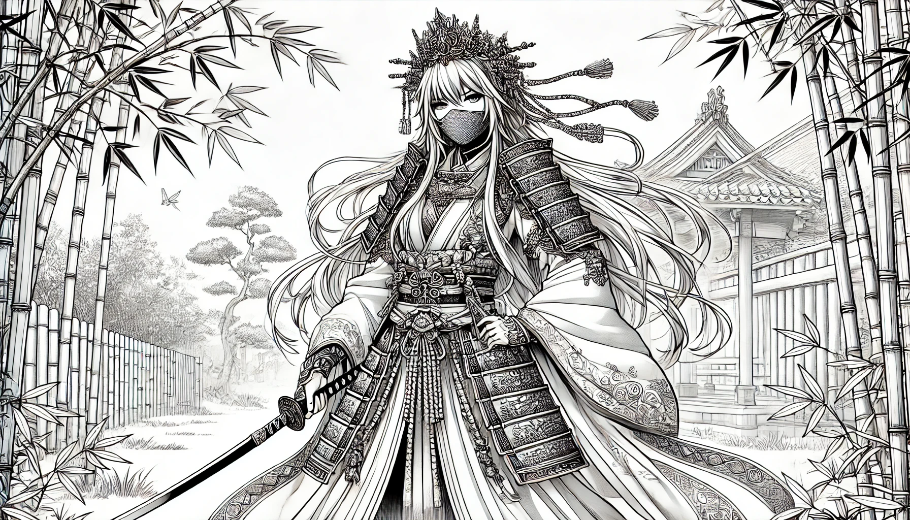 Ai generated anime coloring page female ninja warrior in a photographic pose