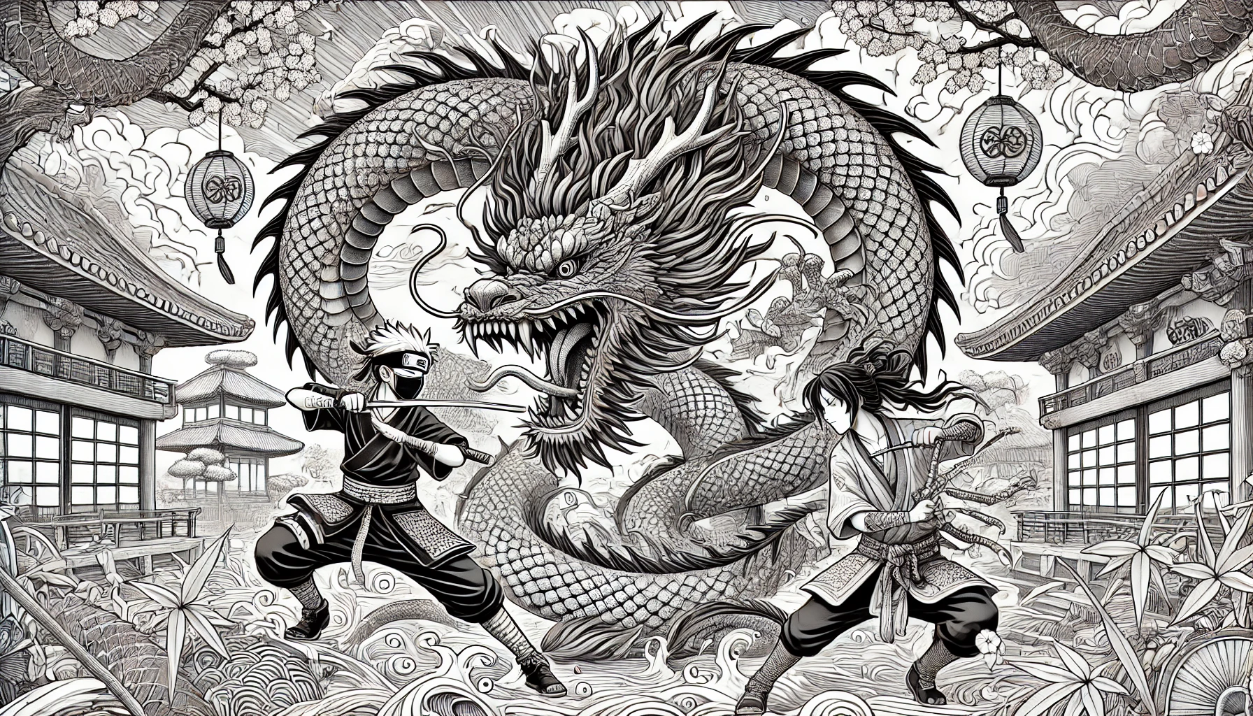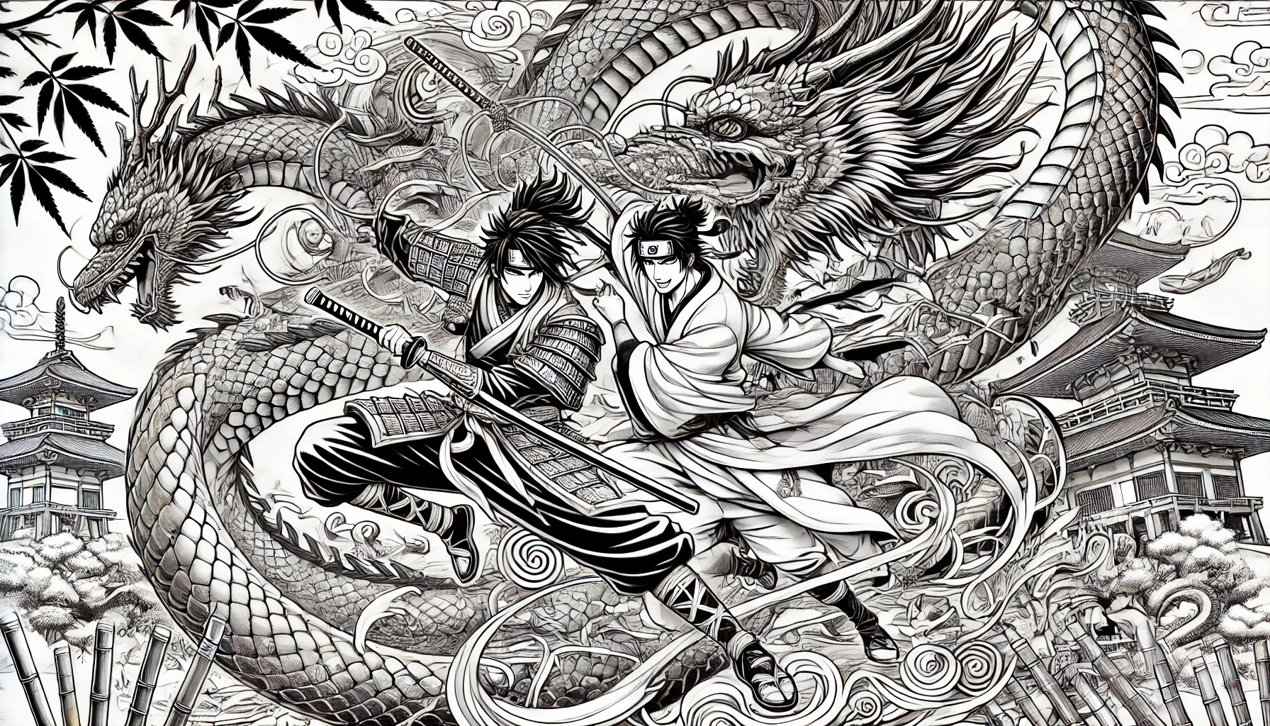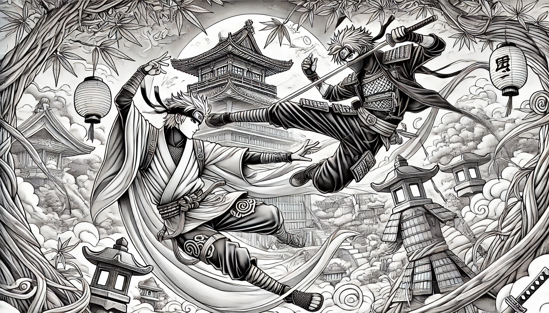 Ai generated anime coloring page epic ninja battle adult coloring page