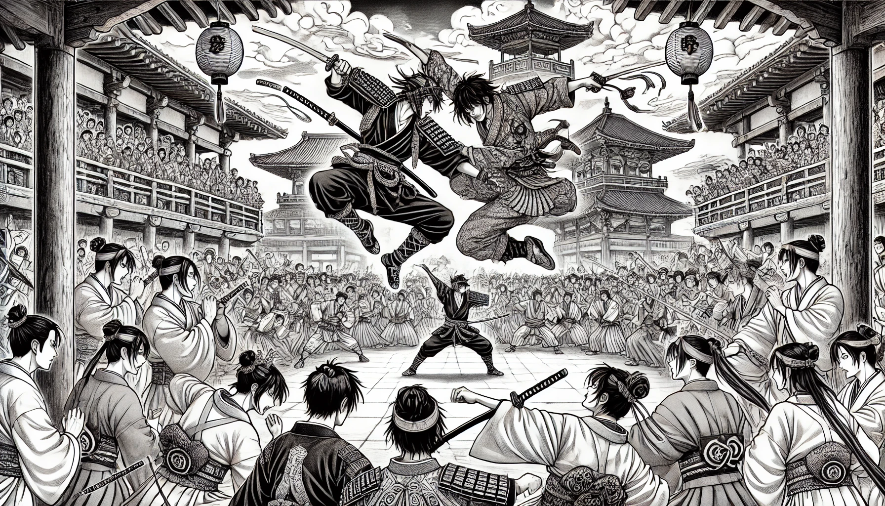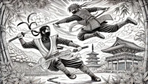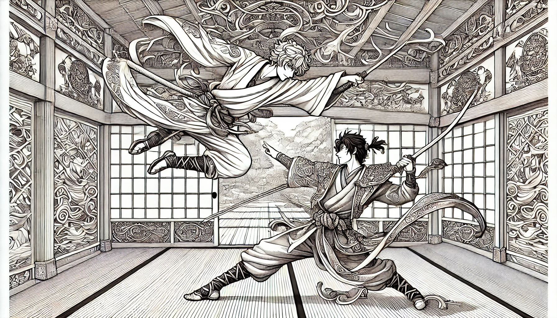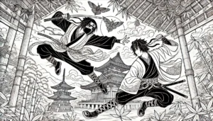 Ai generated anime coloring page ninjas fighting each other in arial combat poses