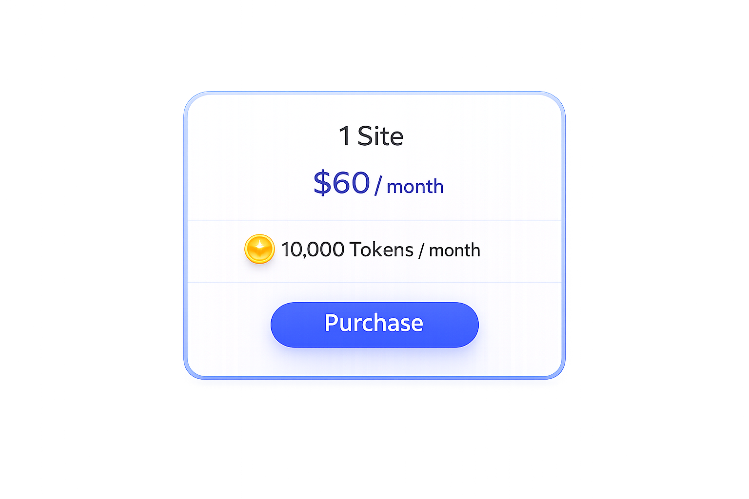 1 Site – $60 a Month – 10,000 Tokens a Month Subscription – Get 10,000 tokens every month for just $60, perfect for managing a single site with reliable, affordable token access.