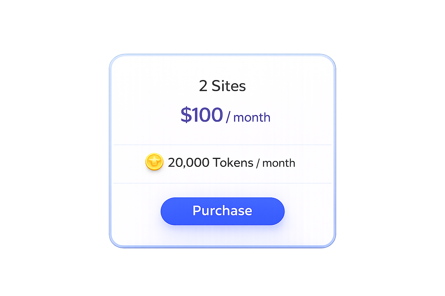 2 Sites $100 a Month with 20,000 Tokens – Flexible & Powerful Plan – Manage two websites effortlessly with 20,000 tokens each month for just $100. Perfect for growing businesses needing reliable, scalable access.